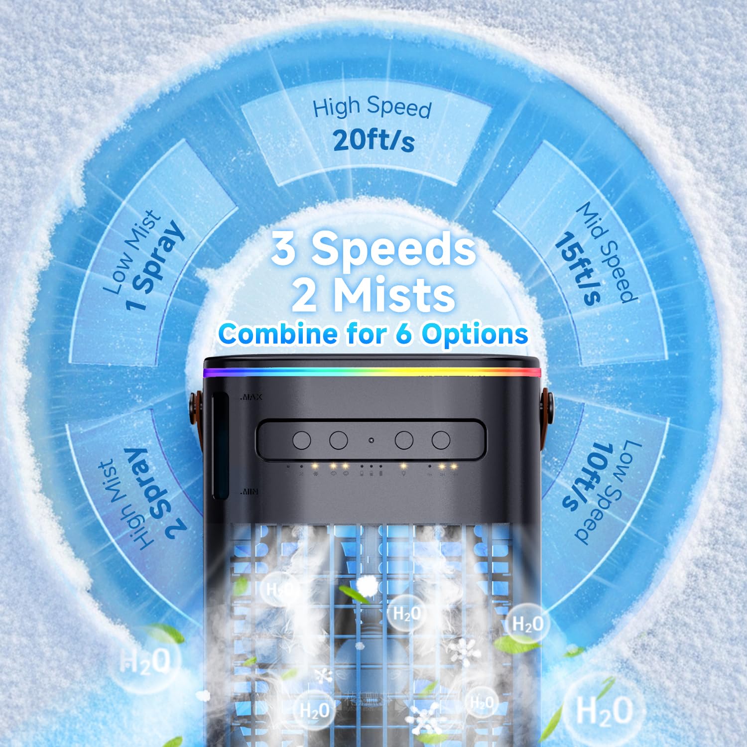 - ❄️【Dual Mist Outlets & Robust Motor for 3S Cooling】Take your cooling to the next level with our air cooler for room! Featuring an upgraded high-temperature resistant motor and an advanced coolant circulation, the small ac delivers rapid cooling while ensuring durability and minimal maintenance. The innovative dual mist outlet boosts cooling efficiency, dropping the surrounding temperature by 41-45°F in just 3 seconds.